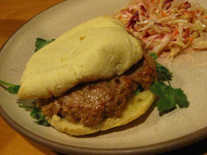 I used buns made from Pao de Quejo Brazilian Cheese bread dough (Chebe makes a gluten free mix that works well for these buns, each package yielding 4 buns that are 4-5 inches in diameter), fresh cilantro, and a sauce made from equal parts of mayonnaise and gluten free Thai sweet chile sauce with a very small amount of gluten free chile paste with garlic. Serve with a side of gluten free coleslaw.