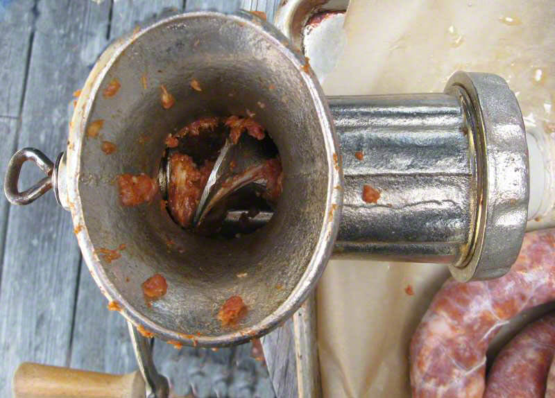 If you have an old fashioned meat grinder, use the blade and the coarsest disk. Again, a great opportunity for living the life of the ancestors presents itself. The sinews can clog up the disk, requiring frequent cleaning, We use our old-fashioned grinder mostly for stuffing the sausage casings. The grinder clamps to the table and can be easily removed, cleaned and stored.