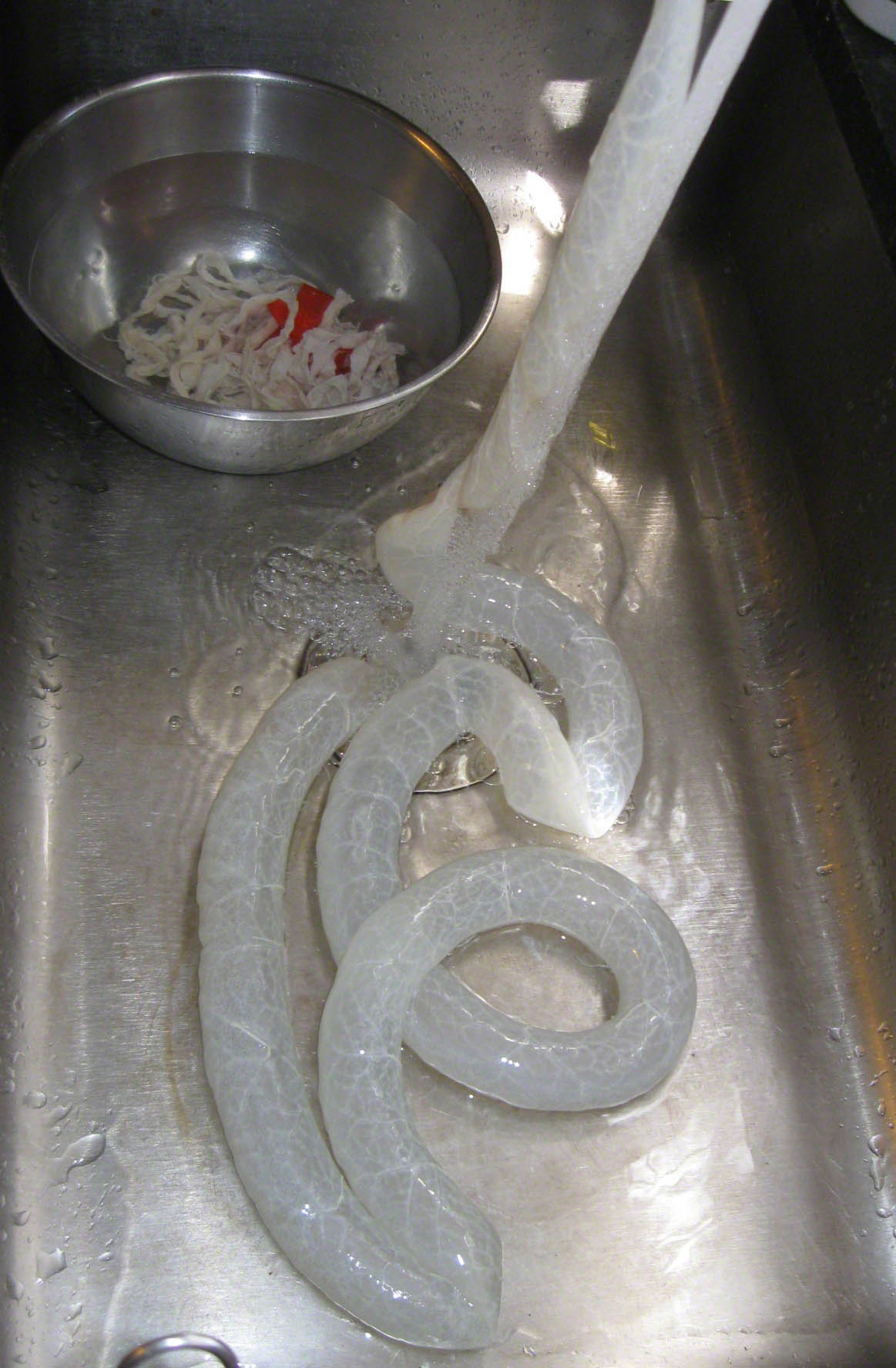 The next step will be preparation of the hog casings. For unknown reasons, hog casings, if you are lucky enough to find any, are usually on the top right hand corner of the supermarket shelf that houses ham and pork products. In a plastic tub or sometimes a plastic bag, the “casings,” which are really cleaned intestines, are packed in salt. Years ago, hog casings had a distinctive funky odor but recently purchased hog casings have had no odor whatsoever. We were surprised to find that packages of hog casings come from all over the world – it is interesting to read the label on the package.