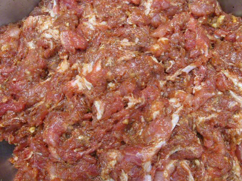 One way or another, chop the marinated meat in to small bits, then chill it while you prepare the casings.