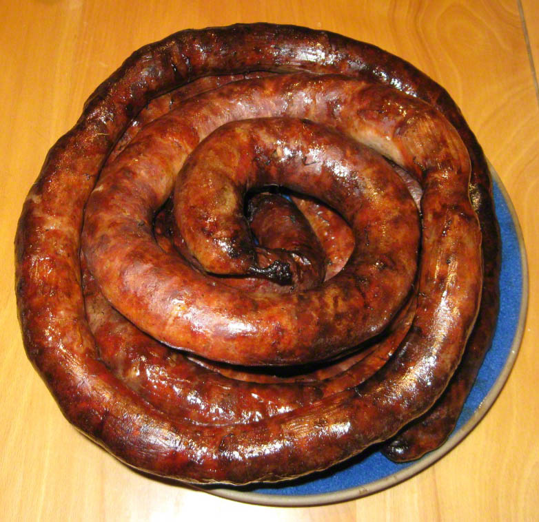 “Fill the casings with the best material [forcemeat]. Shape the sausage in to small circles, smoke. When they have taken on vermillion color, fry them lightly.”