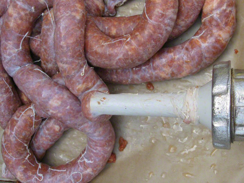 Use a meat grinder to stuff the sausages. You need 3 feet of hog casing per pound of sausage, allowing for a little extra at each end of the sausage. Remove the blade and grinder disk and attach a sausage stuffing funnel. Slide a length of hog casing on to the funnel. Now put the seasoned sausage meat through the grinder, turning the handle slowly and steadily with one hand and easing the meat in to the casings with your other hand. The meat goes in to the hopper and comes out in to the casing. When the casing is nearly full (with 6 inches of empty casing remaining) remove the sausage from the funnel and start on the next sausage. Don’t complicate your life by trying to tie knots in this sausage. Just set the filled sausages aside to chill in the refrigerator until it is time to smoke them.