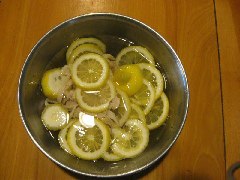 A sliced lemon for soaking the hog casings